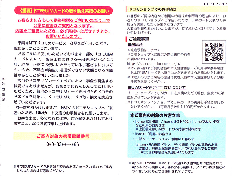 ドコモから「ドコモUIMカードの取り換え実施のお願い」というハガキが届いた。