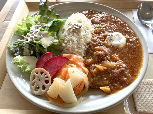カレー。この店はほとんど女性客だから、オジサンにはゴハンが少ないな〜