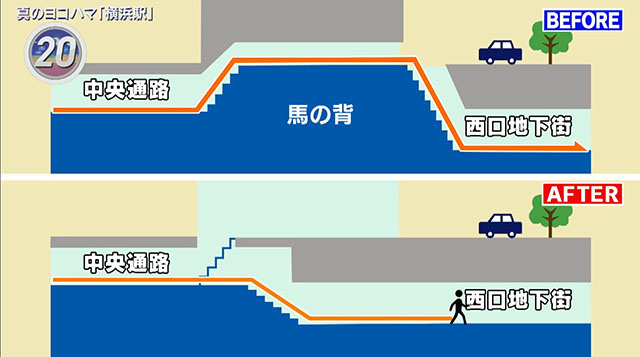 横浜駅の東西の連絡通路から西口のダイヤモンド地下街へ移動するとき、昔は一度地上に上がってから再び階段を下りなければならなかったが、「出没!アド街ック天国」によると今は解消されているというのでさっそく確認。
