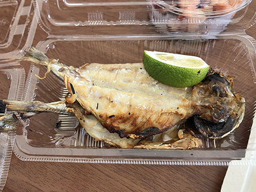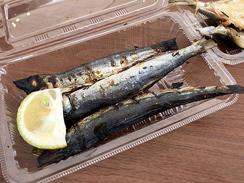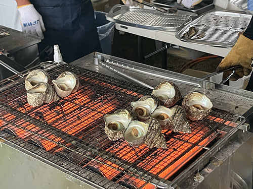 伊勢エビやサザエの浜焼のお店に並んで販売開始の9時半を待つ。お目当ては焼きアワビと干物。