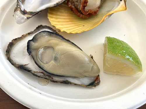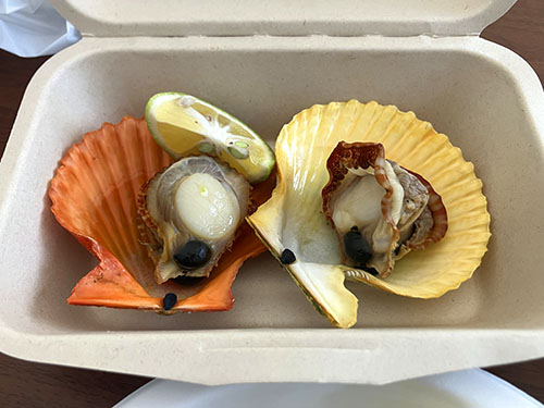 続いて桧扇貝や、佐伯真牡蠣の蒸し牡蠣をゲットし、朝食タイム。