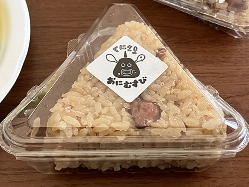 ところが開始2分前ぐらいに遠くからポン菓子の爆発音が聞こえ、それを開始合図と間違えた「たこめし屋」がフライングで販売開始し、ルミチンがたこめしのおにぎりと煮ダコをゲット。おにぎりは用意されていた個数が非常に少なかったようだが、スタッフ曰く「雨だし早く帰りたかったから」らしい。