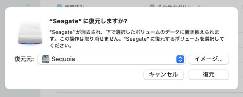 復元元を選ぶ。ここでは、Seagate に Sequoia のシステムを復元する例を示しているが、あくまでも例であり、実際にはやらない(笑)。
