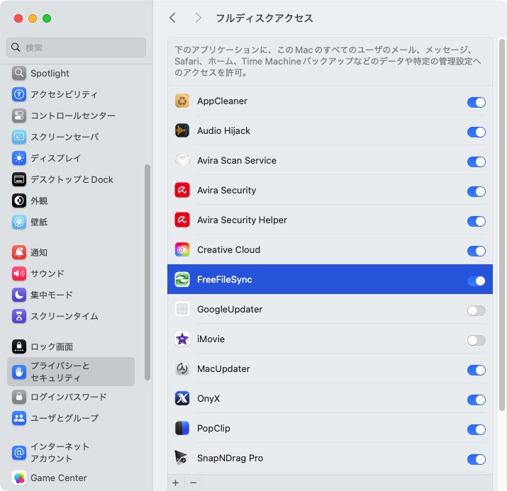 「システム設定>プライバシーとセキュリティ>フルディスクアクセス」にアプリを追加。