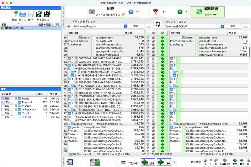 2TB の外付けHDD「Seagate」をデータディスクとし、4TB の外付けHDD の中に「BACKUP」というボリュームを作って、FreeFileSync で両者を同期させている。「Seagate」が復元元、「BACKUP」が復元先である。