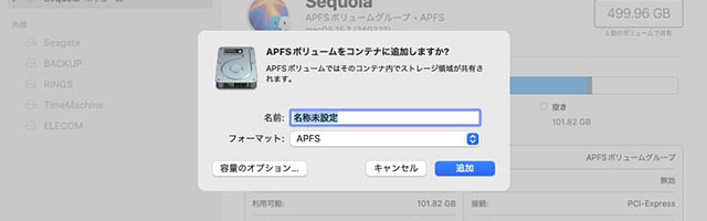 4TBの外付けHDDのうち TimeMachine用にキッチリ1TB確保したいときなどはパーティションを切ればよいが、たとえば Ventura の起動ディスクの中に Sequoia を共存させたいときなどは「ボリューム」として追加した方が便利である。