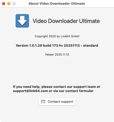 アプリには今回のような細かいアップデートを知らせてくれる機能はなさそうなので、もし調子が悪くなったら「メニューバー>Video Downloader Ultimate>About Video Downloader Ultimate」で、最新バージョンが入っているかどうか確認しよう。