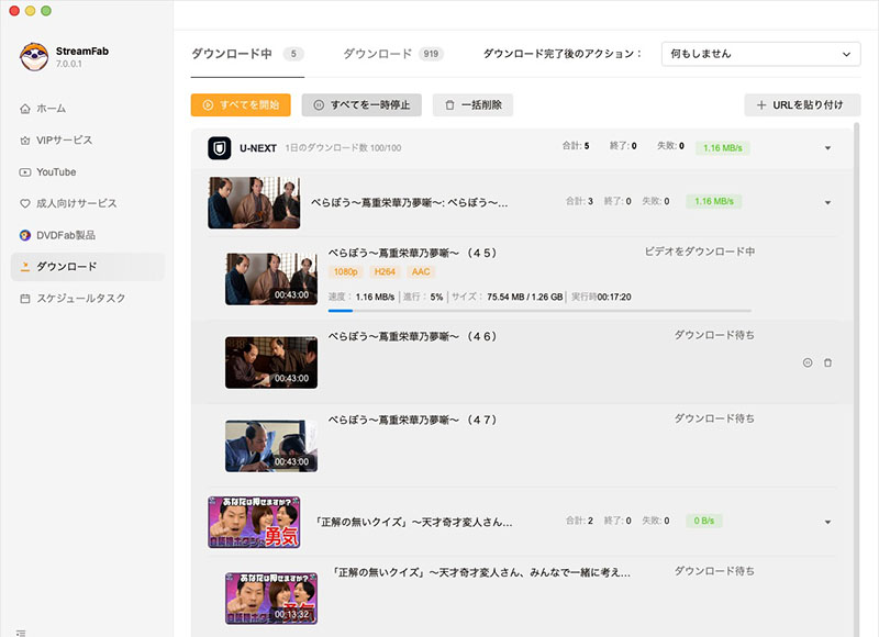 StreamFab の1日に利用可能なダウンロード数は100件。
